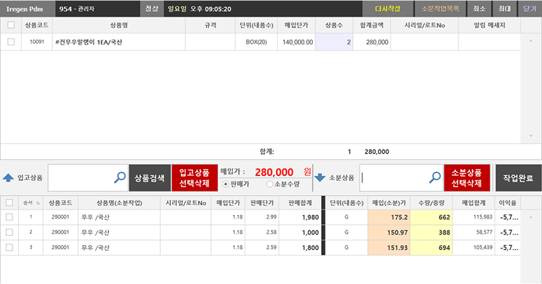 입고 상품코드와 판매 상품코드가 달라 재고관리에 어려움이 많은 품목의 경우 소분작업을 통해 해결할 수 있습니다.